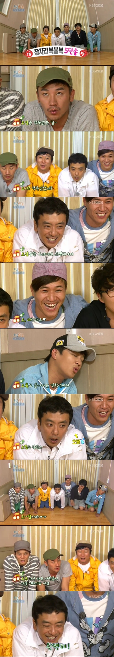 また '1泊2日' メンバーたちは "オ、ムチルはサムシブオ当然に思い出したのがなくて, 五八痛くて, 五球街とかする人々が一番待つ時間, とんぼ福不福時間が帰って来ました"という家事が盛られた 5ダンソングを合唱して笑いを催した. (写真=KBS 2TV 'ハッピーサンデー-1泊2日' 5ダンソング)