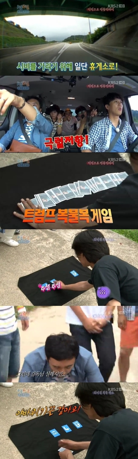 引き続き銃隊を結んだことはまた大きい兄さんキム・スンウだった. メンバーたちは製作陣が作った複雑なチャンス, トランプ福不福で鬼のように願ったカード 3枚を獲得した. 精一杯解釈死んでいる催梯形 PDにキム・スンウは "こんな言葉放送用語なのか分からないがまるでぺテン師みたいですね"と言いながら刺激したこと. 催梯形 PDはただ首を下げるだけだった.