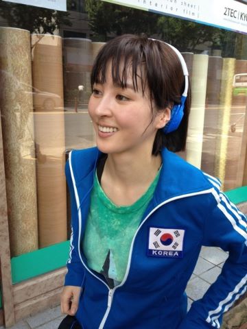 ハン・へジン写真の中で太極マークが描かれたレイニング服を着てヘッドホーンをはめたまま立っている. ハン・へジン化粧気ない顔で汗をだらだら流しながら微笑んだ. 取ることでじっとり濡れたティーシャツがハン・へジンが流した汗羊を見当をつけるようにする.