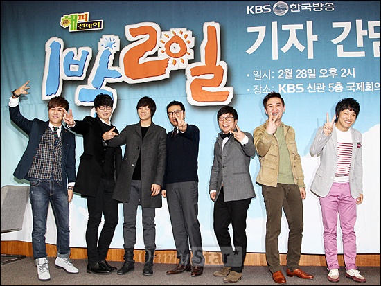▲28日午後ソウル汝矣島 KBS新館国際会議室で開かれた 1泊2日記者懇談会でキム・ジョンミン, ソン・シギョン, 住院, キム・スンウ, 李スグン, オム・テウン, チャ・テヒョンが 1泊2日を象徴する指二つを広げて見せてポーズを取っている. |