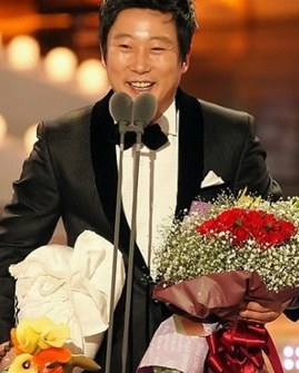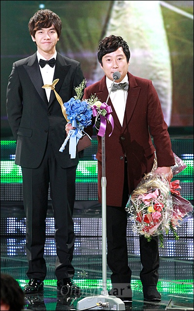 ▲24日夕方ソウル汝矣島 KBSホールで開かれた 2011 KBS芸能対象でショー娯楽MC部門男最優秀賞を受けた李スグンがガングホドングウを言及して受賞の花を持たせている. 李スグンはカン・ホドンの笑い声が懐かしいと人生のモットーである彼と一緒に来年には一緒にしたい望むことを受賞所感で伝えた. |